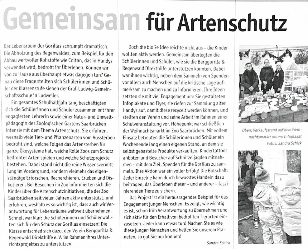 Über ein ganzes Schuljahr haben sich Schülerinnen und Schüler der 7. Klasse mit dem Artenschutz aktiv auseinandergesetzt. Sie haben in Zusammenarbeit mit dem Zoologischen Garten Saarbrücken das Thema des Schutzes, der Verantwortung und der Pflege der Tieren von verschiedenen Seiten erfahren, aktiv mit angepackt und sich für den Verein Berggorilla & Regenwald Direkthilfe engagiert.