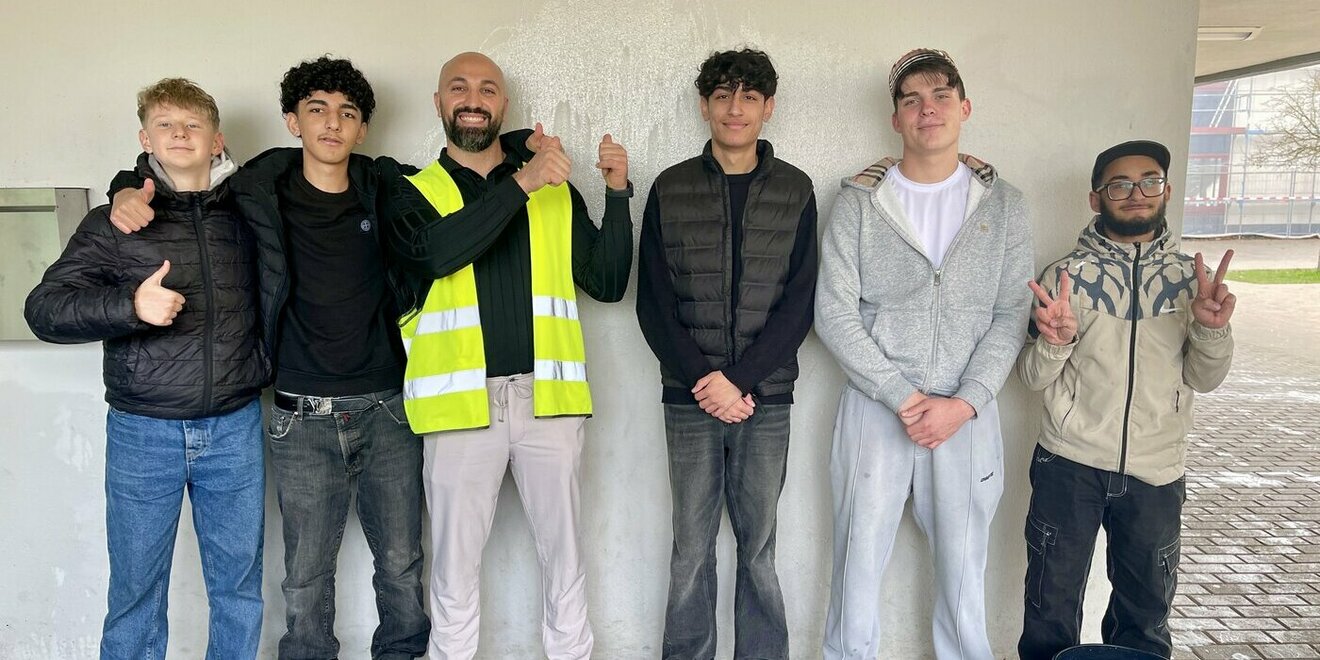 Nach diesem Motto haben sich heute einige Schüler der Klassen 8 und 9 mit ihrem Tutor Herrn Agirman in die Tat umgesetzt und Hand angelegt. Mit vereintane Kräften haben sie mit Schwamm und Wasser die verschmutzte Wand im Eingangsbereich gesäubert.